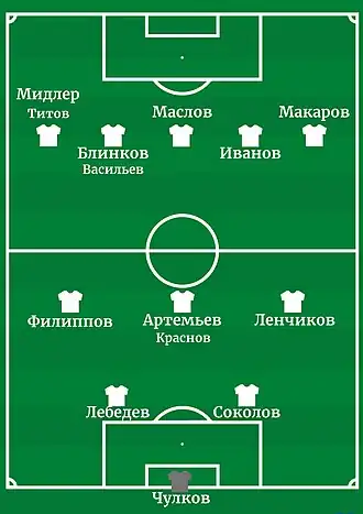 | «Динамо» Москва: Чулков - М.Соколов, Лебедев - Ленчиков, Краснов, Филиппов - Макаров, Васильев, Иванов, К.Блинков Красное Орехово: Михайлов - Вяч.Андреев |