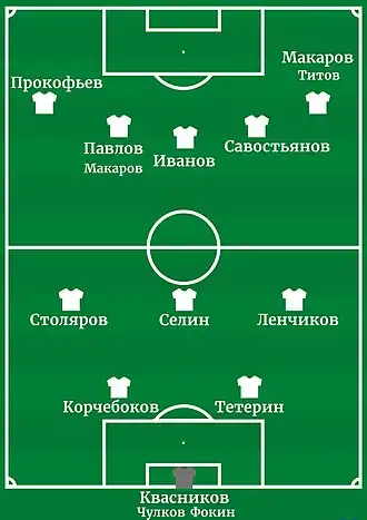| «Динамо» Москва: Савельев - Корчебоков,Тетерин - Ленчиков, Столяров, Лебедев - Макаров, Куликов, Соколов, Жидков, Мидлер | ||||