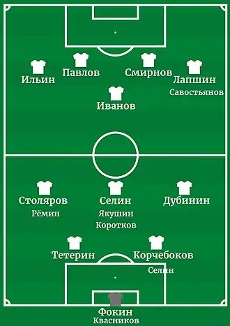 | «Динамо» Москва: Фокин - Корчебоков, Тетерин - Дубинин, Якушин, Столяров - Лапшин, Смирнов, Иванов, Павлов, Ильин |