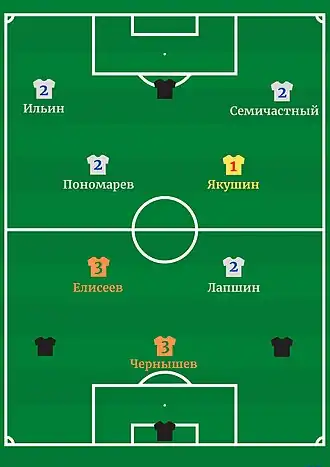 | «Динамо» Москва: Фокин - Радикорский, Чернышев, Ремин - Лапшин, Елисеев - Трофимов, Бехтенев, Смирнов, Поставнин, Ильин |