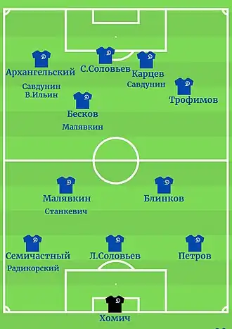 | «Динамо» Москва: [8]Медведев - Радикорский, Петров, Митрофанов - Блинков, Л.Соловьев Сочи (сборная): Кутузов - Нерсесьян, Котов, Приешкин - Г.Соколов, Ланговой - Велисариди, Мишин, Шиманский, Сафонов, Павлов |