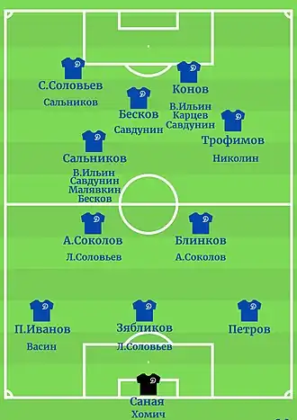 | «Динамо» Москва: Хомич - Петров, Зябликов, Иванов - Блинков, Соколов - Трофимов, Ильин, Бесков «Динамо» Минск: Искорка - Окулевич, Мимрик |