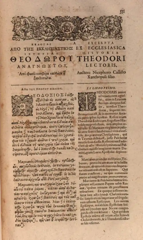Избранное «Церковной истории» Феодора Анагноста, взятое из сочинения Никифора Каллиста Ксанфопула в книге «Historiae Ecclesiasticae Scriptores Graeci». Amstelodami. 1695 год