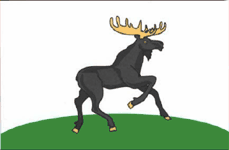 «Прямоугольное полотнище белого цвета с отношением ширины к длине 2:3, несущее посередине изображение обращённого от древка лося, идущего по зелёной земле, воспроизведенной вплотную к нижнему краю; изображение выполнено в чёрном (или — красном), жёлтом и зелёном цветах».