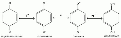 - восстановление сопровождается переносом одного электрона. Присоединение одного электрона приводит к образованию семихинона (анион-радикала), после присоединения второго электрона образуется дианион двухатомного фенола, конечный продукт восстановления — гидрохинон: