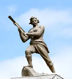 | Барельеф с изображением Фархада на горе Бисутун и Ширин, на памятнике Низами в Баку. Выполнено А. Хрюновым по эскизам Газанфара Халыкова, 1949 |