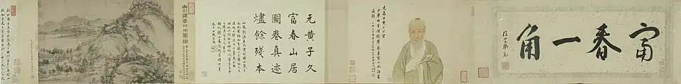 Век спустя «Жилище в горах Фучунь» волею судеб оказывается в коллекции минского мастера Шэнь Чжоу (1427—1509) (на свитке есть его надпись). Далее, согласно канонической версии, Шэнь Чжоу отдаёт его некоему каллиграфу для надписи, сын которого передаёт свиток кому-то ещё. Сменив несколько хозяев, он оказывается в собрании известного минского художника и коллекционера Дун Цичана, оставившего на свитке восторженный отзыв, в котором в частности пишет: «В свитке с изображением горы Фучуньшань отклик души уносится в необычайное, парит. Вобрав в себя приёмы разных мастеров, Цзы-цзю переплавил их на свой лад, ушёл от проторённых путей. Поистине веришь, что перед тобой произведение небожителя, парящего над лесом искусств, далеко от пыли мирской суеты».