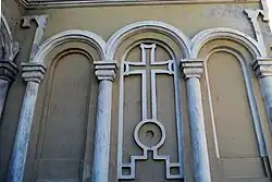 Внешнее убранство церкви состоит из крупно профилированных архивольтов на полуколоннах, образующих оригинальную аркатуру. Окна имеют металлические оконные решетки и глухие простенки.