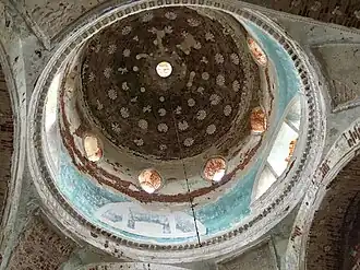 К четверику примыкают узкий, поперечно ориентированный прямоугольный алтарь с полукруглым выступом апсиды и обширная, сильно вытянутая по продольной оси трапезная со скруглёнными западными углами. Внутри купольную ротонду несут мощные угловые пилоны четверика и подпружные арки, алтарь перекрыт конхой и пересекающимися цилиндрическими сводами. Ведущую роль в убранстве интерьера играет лепнина и гармонирующая с ней, выполненная в разбелённых охристых и голубых тонах гризайльная живопись[4]. Наиболее эффектно декорированы купол и барабан. Купол украшен перспективными, сокращающимися к центру кессонами, на которых ярко выделяются лепные розетки. В барабане присутствуют тройные окна; в основании барабана проходит штукатурный карниз.