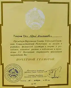 В 1979 году Юрий Николаевич Чен был награжден Почетной Грамотой Президиума Верховного Совета УзССР.