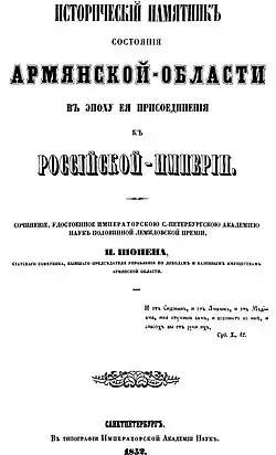 - Шопен И. И., «Исторический памятник состояния Армянской области в эпоху её присоединения к Российской империи»