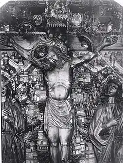 Распятие в резном ансамбле закреплено на семиконечном кресте[14]. Святой Праведный Иоанн Кронштадтский описывает подобный крест так: «семиконечный, с косым подножием и двумя верхними дщицами, но самая верхняя дщица совершенно закрывает верхний конец прямого дерева креста, представляя вместе с ним подобие буквы Т»[15]. Наиболее известными и почитаемыми из крестов подобной иконографии являются Дмитровский чудотворный крест (Государственная Третьяковская галерея); Кийский крест (храм преподобного Сергия Радонежского в Крапивниках, Москва); Чудотворный крест, установленный патриархом Никоном на Голгофе Воскресенского сбора Воскресенского Новоиерусалимского монастыря[16]. Известны два креста с Распятиями: из молельни при церкви Воздвижения Креста Господня и запрестольное Распятие из алтаря церкви Воскресения Христова (Воскресения Словущего) Большого Кремлёвского Дворца.[17]