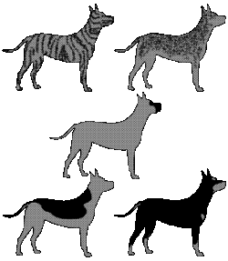 | — равномерное распределение обоих пигментов по волосу и телу | CBD 103[49] | — сплошное распределение пигмента по волосу и корпусу собаки, доминантный сплошной окрас; — тигровость; — равномерное распределение пигмента подавлено, проявляется действие локуса . | · Доминантный сплошной[50], тигровый · Литтл полагал, что доминантный чёрный окрас определяется геном [51], а тигровый геном [12] · Распространение по корпусу тигровин варьирует в широком диапазоне — от нескольких тёмных полос на рыжем до почти сплошного затемнения; неизвестно, обусловлена ли степень тигровости наследственными, случайными факторами, или их комбинацией[47]. | |