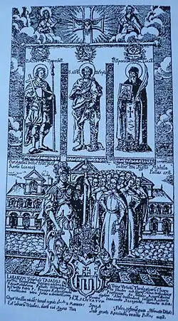 5) картина, гравированная резцом: вверху Святая Троица, ниже — апостол Петр, слева и справа от него надписи; внизу — Паллада (хранится в библиотеке Киево-Софийского собора);