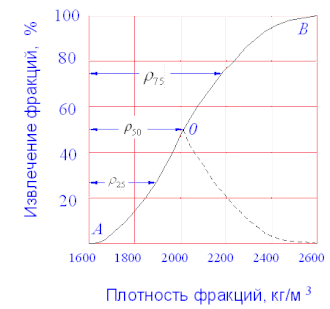 Графические методы базируются на использовании кривых разделения Тромпа. По результатам фракционного анализа продуктов обогащения строят кривую извлечения фракций, из которой определяют плотность разделения ρр (плотность фракции, извлечение которой равняется 50 %), среднее вероятное отклонение Еpm = (ρ75 - ρ25)/2 и коэффициент погрешности разделения J = Еpm / ρр - 1000, которые используют как критерии эффективности разделения, а также как показатели для оценки технологической пригодности обогатительных аппаратов.