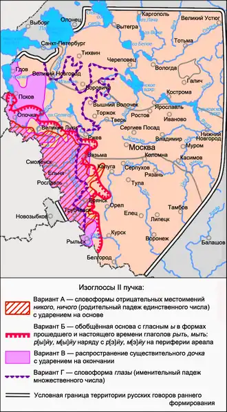 В отличие от I пучка изоглосс II пучок не захватывает центральных и восточных областей южного наречия. Изоглоссы варианта Б в отличие от изоглосс варианта А выходят за границу южнорусского наречия и охватывают часть западных среднерусских акающих говоров. Изоглоссы варианта В распространяются ещё севернее в пределах западных среднерусских окающих говоров (главным образом Гдовской группы), а изоглоссы варианта Г частично проникают на территорию севернорусского наречия[18].