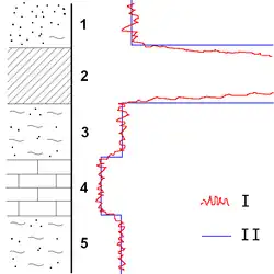 - Литологическое расчленение разреза на пласты. Интенсивность гамма-излучения отличается у разных пластов пород, так как в них содержится разное количество радиоактивных элементов. Наибольшие показания у породы, содержащей калий-40, радий и другие радиоактивные элементы; отдельно следует упомянуть граниты и глины, содержащие большое их количество. Минимальные значения наблюдаются у карбонатов и чистых песчаников, углей, пород гидрохимического происхождения, хемогенных осадков (ангидритов, гипсов, галита).