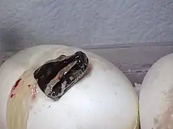 Тёмный тигровый питон во время выхода из яйца с яйцевым зубом