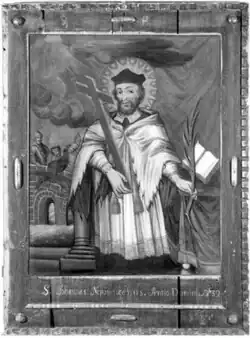 Образ святого Яна Непомука написан на холсте масляными красками, который был прикреплен к доске, обрамленной в узкую деревянную резную раму. Во время реставрации полотно было снято с деревянного щита и натянуто на подрамник. И надпись на латыни «S. Iohannes Nepomucenus. Anno Domini 1732», что указывает на дату создания иконы, осталась на прежнем прочном основании. Рамка с вышеуказанной надписью от иконы «Ян Непомук» была найдена в хранилище музея[1].