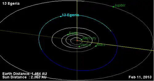 (13) Эгерия (лат. Egeria) — астероид главного пояса, принадлежащий к довольно редкому спектральному классу G[6]. Астероид был открыт 2 ноября 1850 года итальянским астрономом Аннибале де Гаспарисом в обсерватории Каподимонте, Италия и назван в честь древнеримской нимфы воды Эгерии[7]. Название было предложено французским астрономом Урбеном Леверье, первооткрывателем Нептуна.