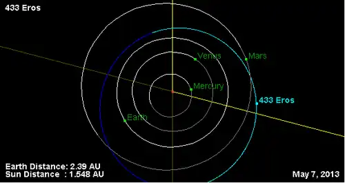 (433) Эрос (др.-греч. Ἔρως) — околоземный астероид из группы Амура (I), принадлежащий к светлому спектральному классу S. Он был открыт 13 августа 1898 года германским астрономом Карлом Виттом в обсерватории Урания[6] и назван именем Эрота, бога любви и неотлучного спутника Афродиты, согласно древнегреческой мифологии[7]. Это первый открытый околоземный астероид.