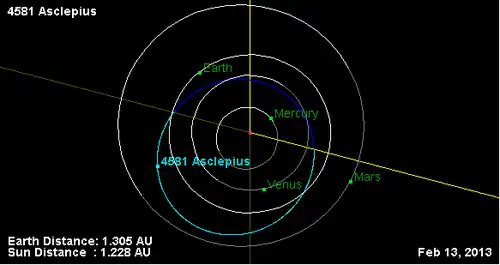 - ↑ NEODyS-2 Close Approaches for (4581) Asclepius. Near Earth Objects - Dynamic Site. Дата обращения: 8 ноября 2011. Архивировано 5 февраля 2013 года.