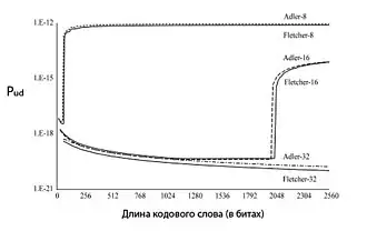 Хотя контрольная сумма Adler не определена официально для других длин слов данных, можно использовать самое большое простое целое меньшее 24=16 и 28=256, чтобы реализовать 8- и 16-битные контрольные суммы Adler для целей сравнения. Имея похожий алгоритм, контрольная сумма Adler имеет схожую производительность с суммой Fletcher. Все 2-битные ошибки обнаружены для слов данных длиной меньше, чем M*(k/2) бит, где k — размер контрольной суммы, M равняется модулю суммы Adler. Как и в случае с контрольной суммой Fletcher, наихудшее значение вероятности необнаруженной ошибки наблюдается при одинаковом количестве нулей и единиц в каждом блоке данных. Adler-8 и Adler-16 обнаруживают все групповые ошибки длиной меньше, чем k/2 бит. Adler-32 обнаруживает все групповые ошибки длиной не более 7 бит. Рисунок1 показывает зависимость вероятности необнаруженных ошибок для контрольных сумм Adler и Fletcher для частоты битовых ошибок 10−5.