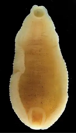 Передняя присоска округло-овальная, 0,6 мм в продольном измерении и 0,7 мм в поперечном, умеренно вогнутая (чашеобразная), с тонкими краями. Покрыта сосочками. Ротовое отверстие крупное, открывается по центру присоски на вершине крупного куполообразного сосочка. Желудок образует 7 пар карманов (отростков), передние 6 из которых двулопастные, последняя пара образует большое количество тонких долей. Задняя присоска продолговато-овальная, 1,1 мм в продольном измерении и 1,0 мм в поперечном, с толстыми краями. Расположена вентрально, так, что едва видна со спинной стороны.