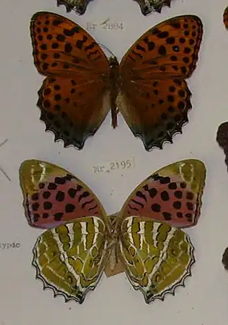 Размах крыльев 8—9 см. Передние крылья со слегка вогнутым внешним краем, край задних крыльев волнистый. Основной фоновый цвет крыльев самца красновато-рыжий. Вдоль края крыльев тянутся три перевязи, образованные округлыми черными пятнами. Нижняя сторона передних крыльев большей частью окрашена в персиковый цвет и несёт на себе чёрные пятна, нижняя сторона задних крыльев — светло-зелёная с тонкими серебристыми перевязями. Жилки R1, R2 не ветвятся и берут начало от центральной ячейки. Жилки R3, R4, R5 имеют общий ствол, который также начинается от центральной ячейки. На заднем крыле жилка M3 и жилка Cu1 отходят от центральной ячейки из одной точки. У самцов сверху на передних крыльях вдоль жилок могут располагаться андрокониальные поля. Половой диморфизм проявляется в окраске крыльев.