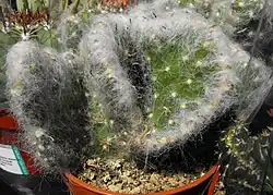 Побеги диаметром 1,5-3 см, с густыми, белыми волосками, из волосков выступают короткие цилиндрические тёмно-зелёные листочки длиной 1-3 см.