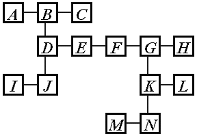 Сеть BITNET строится по принципу «от точки к точке». В сети существует только один путь из «точки A в точку B». Если сеть выглядит так, как показано на рисунке, и мы посылаем сообщение из компьютера «A» в компьютер «N» то оно пройдёт по следующему пути: