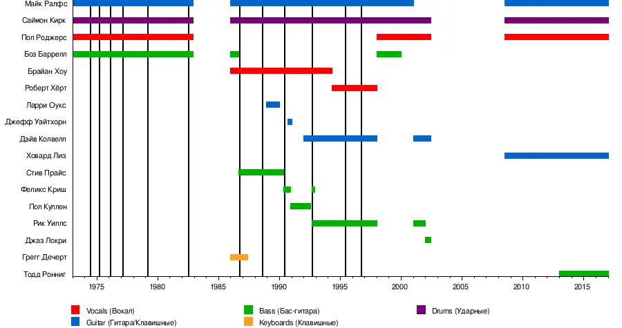 - Саймон Кирк — ударные, бэк-вокал (1973–1982, 1986–1999, 2001–2002, 2008 – настоящее время)