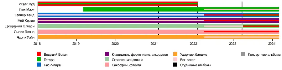 - Исаак Вуд — ведущий вокал, гитара (2018–2022)