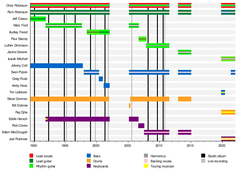Перед выпуском первого альбома состав выглядел следующим образом: Крис Робинсон (вокал), Рич Робинсон (гитара), Джонни Кольт (бас), Джефф Сиз (гитара) и Стив Гормэн (ударные).