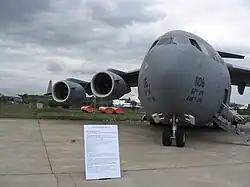 Boeing C-17 Globemaster III (Боинг C-17 «Глоубмастер» III) — американский военно-транспортный самолёт. Разработан для замены грузового самолёта Lockheed C-141 Starlifter. Первый полёт совершил 15 сентября 1991 года, официально введён в эксплуатацию в январе 1995 года[4]. Поставлялся на вооружение Военно-воздушных сил США компанией McDonnell Douglas. C-17 носит название двух предыдущих военно-грузовых самолётов: Douglas C-74 Globemaster и Douglas C-124 Globemaster II. C-17 обычно выполняет стратегические воздушные перевозки грузов и войск, дополнительно — тактические миссии, перевозку больных и сбрасывание с самолёта грузов.