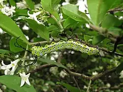 Гусеницы питаются на растениях рода Бирючина (Ligustrum) из семейства маслинные (Oleaceae).