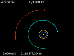 Перед тем как войти во внутреннюю часть Солнечной системы для прохождения перигелия в 1982 году, C/1980 E1 имела барицентрическую (эпоха 1 января 1950) орбиту с афелием 74 300 а. е. (1,17 светового года) и периодом обращения примерно 7,1 миллиона лет[4].