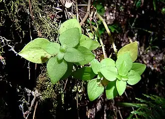 Травянистое полегающее растение, достигающее высоты до ± 35 см. Корни мочковатые. Стебли зеленые, диаметром до 1,5 мм, голые, за исключением двух вертикальных рядов сосочковых волосков. Междоузлия достигают до 1 см. Листья имеют размеры 1—5 х 0,7—2 см, темно-зеленые, от обратнояйцевидной до эллиптической формы, острые, с цельными краями[4].