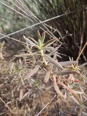 Многолетние кустарники достигают высоты до 25 см, преимущественно разветвлены от основания. Ветви полегающие или извилистые, часто слегка деревянистые, с сохранением старых листьев, которые не опадают. Листья имеют форму от линейной до линейно-ланцетной или узкоэллиптической, размерами (10-)15-25(-35) х 2-3 мм. Они тупо острые или округлые, дорзивентрально уплощенные или слегка выпуклые с обеих сторон. Краевые реснички вздуты и часто отогнуты, листья могут быть сероватыми, от зеленого до желтовато-зеленого или коричневого, иногда красного цвета[3].