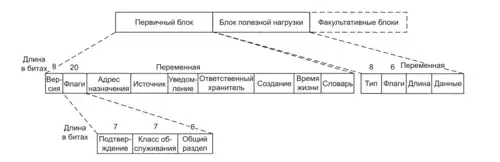 Каждое сообщение состоит из первичного блока, который можно считать заголовком, блока полезной нагрузки (для данных) и факультативных блоков (например, для параметров безопасности). Первичный блок начинается с поля Версия, за которым следует поле Флаги. Помимо всего прочего, с помощью флагов указывается класс обслуживания (чтобы источник мог отметить посылку как высокоприоритетную или низкоприоритетную) и другие обрабатывающие запросы (например, должен ли получатель подтвердить доставку).