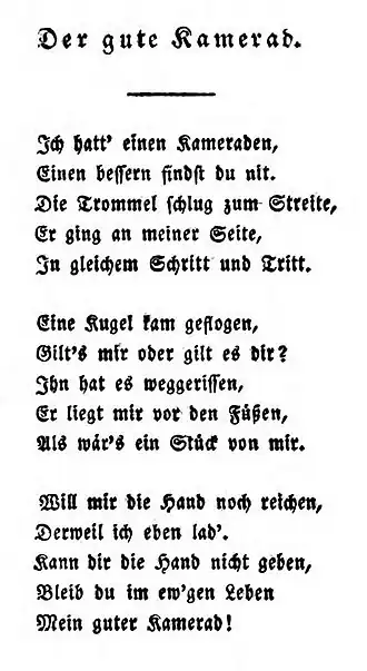 Ich hatt' einen Kameraden, Eine Kugel kam geflogen: Will mir die Hand noch reichen, |