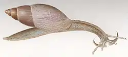Тело светло-серое или бурое, длиной от 7 до 10 см. Раковина удлинённая, веретеновидной формы, с толстыми стенками, узким овально-серповидным устьем и выдающимися линиями роста, буровато-розовая или светло-бурая, длиной обычно до 40—50 мм, а иногда до 60 и даже 76 мм, и 27,5 мм в диаметре. Нижние щупальца длинные, серповидно загнутые, почти касаются земли.