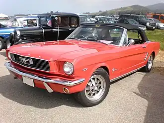 Первый Mustang покинул конвейер утром 9 марта 1964 года, а к концу этого же года было продано 263 434 машины[6][7]. В качестве основы для дизайна Mustang был использован стилистический «ключ» люксового купе Continental Mark II середины пятидесятых годов — с характерными пропорциями с длинным капотом и коротким багажником и пластикой боковины кузова с изломом над аркой заднего колеса.
