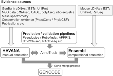 В проекте GENCODE применялись ручная и автоматическая аннотация. При верификации результатов использовались данные лабораторных экспериментов[21].