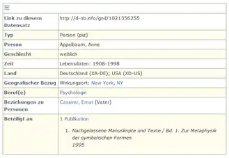 - ↑ Behrens-Neumann R. Die Gemeinsame Normdatei (GND) –Ein Projekt kommt zum Abschluss (нем.) / Hrsg.: Deutsche Nationalbibliothek — S. 1.