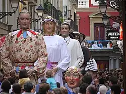Парад начал распространяться по Испании в 1424 году, когда в Барселоне он стал проводиться ежегодно 25 сентября (в день Святого Марка). Немного позже он распространился в Кастилии и Арагоне. Там к шествию начали добавлять музыку, под которую поворачивались фигуры. После этого парад стал распространён в Наварре и Валенсии. Позже он распространился во всей Испании, а затем в других частях света.