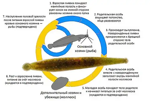 Эктопаразит. Питается кровью рыб (показано питание на лабео, Labeo).