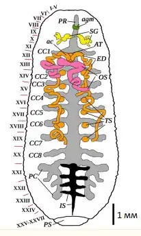 Имеется мускулистый хобот с тонкой оболочкой. Желудок с девятью парами карманов (отростков), задние карманы ветвятся, образуя 4 слепых отростка. Кишечник также образует 4 пары коротких карманов.