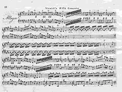 Ryom-Verzeichnis, подробно описал в двух томах Ryom (1986) и Ryom (2007), сделав краткое изложение известных сохранившихся публикаций, рукописных копий рукописей и аранжировок концертов. Из них шесть были аранжированы Бахом: три из них для скрипки соло были аранжированы для клавесина; два двойных скрипичных концерта для органа (две клавишные и педаль); а один из концертов для четырех скрипок был переложен для четырех клавесинов и оркестра.[4] Еще четыре аранжировки для клавишных появляются в книге Энн Доусон, английской антологии аранжировок для клавикорда, девственницы или клавесина, датируемой примерно 1720 годом, подготовленной неизвестной рукой.[4] Как Ryom (1986), пятый концерт Op.3, No.5, RV 519 — это уникальный концерт, для которого было сделано так много транскрипций: они подробно описаны в Talbot (2010).