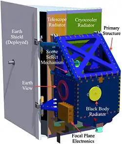 Инфракрасный телескоп TIRS использует 4 линзы, изготовленные из германия и селенида цинка[14]. Телескоп охлаждается до 185 кельвинов за счет излучения тепла с специального радиатора[17].